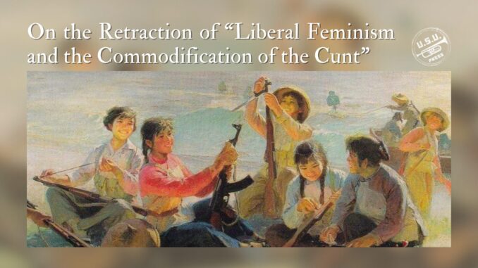 As a preliminary matter, disorganization within Unity–Struggle–Unity has delayed the writing and publication of this piece for far longer than was hoped. This criticism addresses theory proposed in an article which the Red Clarion carried, “Liberal Feminism and the Commodification of the Cunt.” Shortly after its publication, the article was retracted by the paper’s Editorial Board, which has since pursued a process of internal criticism seeking to determine what institutional failings led to this piece’s original publication.